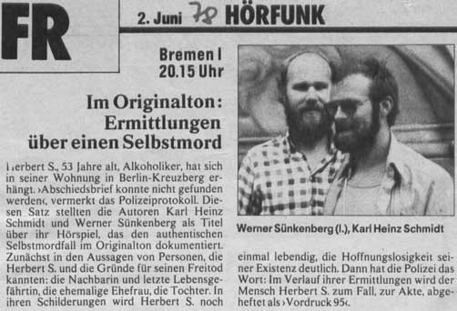 im Erdgeschoß scheint sich niemand das Leben zu nehmen." Die Bezeichnung "Hörspiel" hat für die Sache etwas Makabres. Dennoch handelt es sich, nimmt man sie als ein Stück