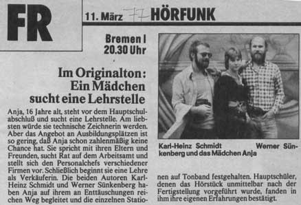 "Anja oder Was tun?" (Realisation: Schmidt/Sünkenberg/Christian Gebert). Ein verblüffendes Dokument, das ebenso die Chancen wie die Grenzen der Authentizität offen aufgezeichneter Gespräche zeigt. Ein